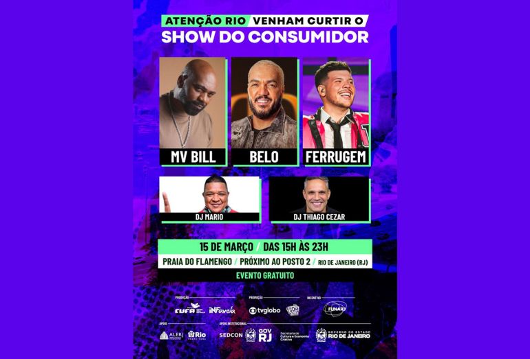Em comemoração ao Dia do Consumidor, celebrado no próximo sábado, 15 de março, a Central Única das Favelas (CUFA) e a InFavela promovem, com apoio da Assembleia Legislativa do Estado do Rio de Janeiro (ALERJ) e da Prefeitura do Rio, o “Show do Consumidor”, a partir das 15h, na Praia do Flamengo.